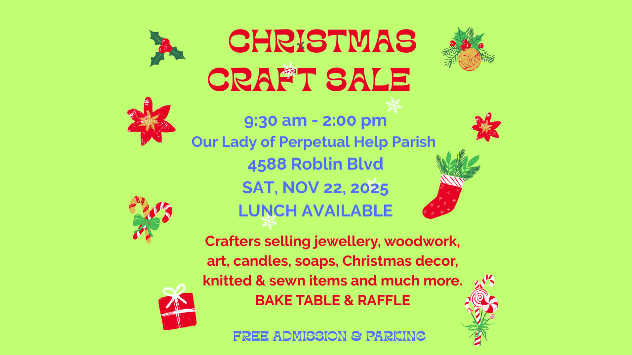 Join us for our annual Christmas Craft Sale. We will have 18 crafters selling a variety of items from Art, books, jewellery, handmade soaps & candles, Christmas decor, sewn and knitted items and much more.